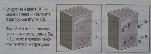 Кроме того многие производители комплектуют свои стиральные машины специальными заглушками, на место транспортировочных болтов. Рекомендуется их установить, чтобы исключить лишнее попадание пыли во внутрь стиральной машинки.